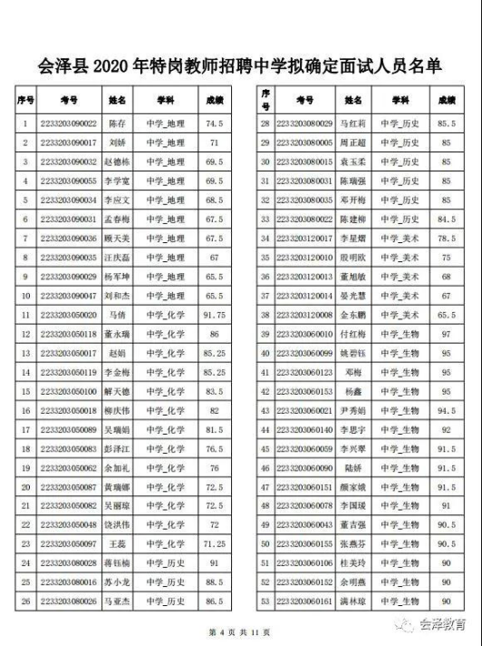 附件:會(huì)澤縣2020年特崗教師招聘中(。⿲W(xué)擬確定面試人員名單