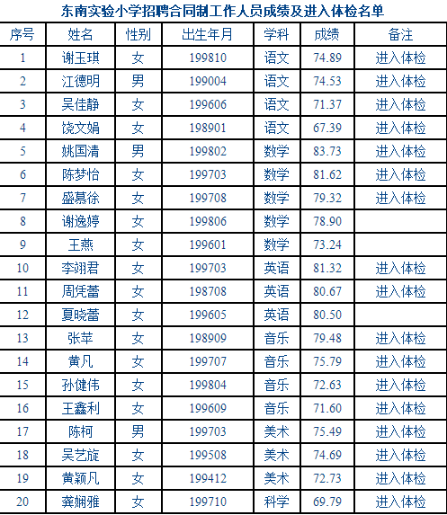 常熟市東南實(shí)驗(yàn)小學(xué)2020年招聘合同制工作人員材料審查工作已結(jié)束,根據(jù)招聘簡(jiǎn)章,現(xiàn)將進(jìn)入體檢環(huán)節(jié)的人員名單予以公布。具體體檢時(shí)間另行通知。