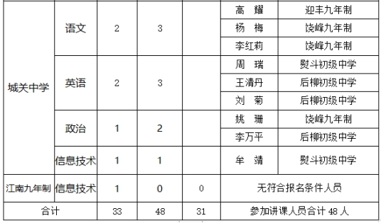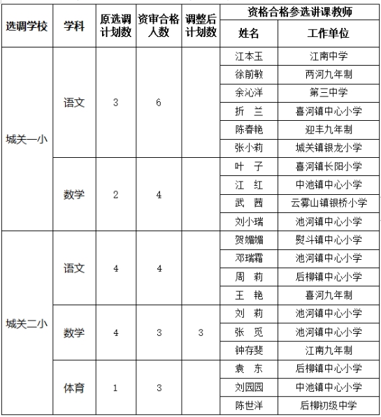 據(jù)《2020年石泉縣城區(qū)部分中小學(xué)第二輪教師選調(diào)公告》相關(guān)要求,經(jīng)過(guò)報(bào)名、資格審核等,共有48名教師符合選調(diào)報(bào)名條件,現(xiàn)將資格審核合格參加選調(diào)講課教師(以下統(tǒng)稱“參選講課教師”)名單及選調(diào)講課有關(guān)事項(xiàng)公告如下: