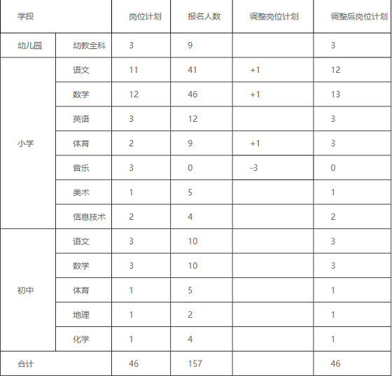 根據(jù)《麻城市2020年城區(qū)學(xué)校公開選聘鄉(xiāng)鎮(zhèn)教師公告》,截止2020年8月19日下午17:30,幼兒園、小學(xué)及初中共報(bào)名157人。依據(jù)公告,“報(bào)名人數(shù)與崗位數(shù)比例原則上應(yīng)達(dá)到3:1及以上,方能開考;未達(dá)到規(guī)定比例的,調(diào)減相應(yīng)崗位計(jì)劃,調(diào)劑到其它競爭性強(qiáng)的學(xué)科”的規(guī)定,小學(xué)信息技術(shù)、初中地理分別有4人、2人報(bào)考,降低開考比例為2:1;小學(xué)音樂無人報(bào)考,取消崗位計(jì)劃,調(diào)劑到小學(xué)語文、小學(xué)數(shù)學(xué)、小學(xué)體育崗位,詳細(xì)情況見下表: