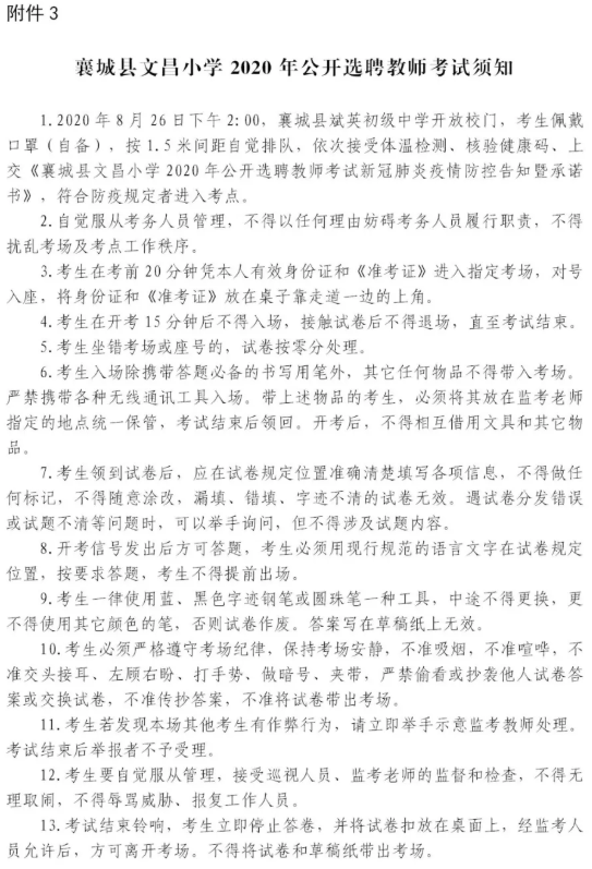 3.襄城縣文昌小學(xué)2020年公開選聘教師考試須知