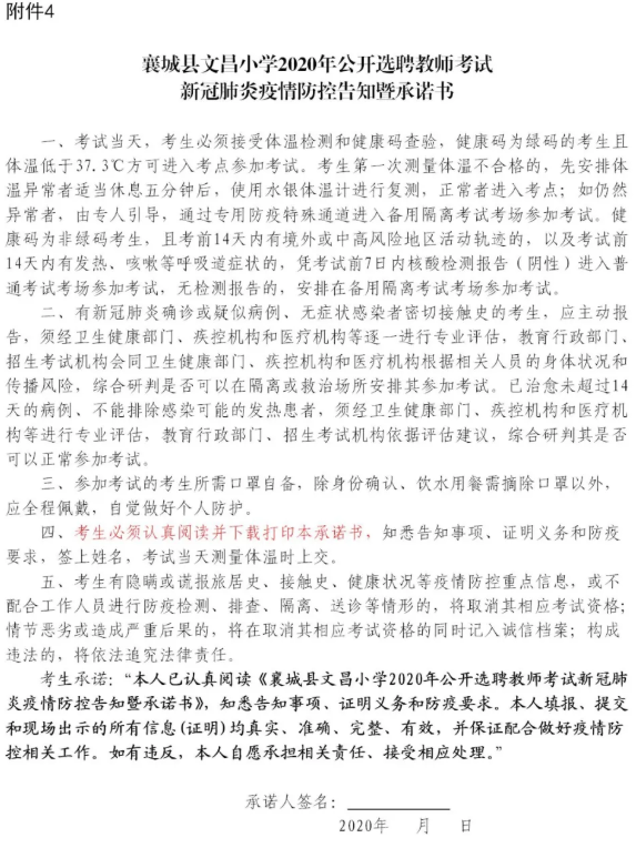 4.襄城縣文昌小學(xué)2020年公開選聘教師考試新冠肺炎疫情防控告知暨承諾書