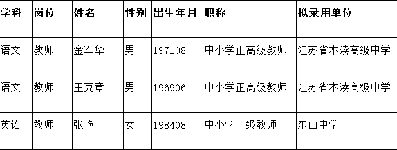 根據(jù)《2020年蘇州市吳中區(qū)引進教育人才公告》,經(jīng)過材料初審、專業(yè)考核和面試、體檢和政審合格,擬錄用以下3名同志,現(xiàn)公示如下: