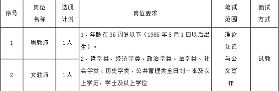中共武岡市委黨校為武岡市財政全額撥款的參公管理事業(yè)單位,新校區(qū)坐落在武岡市新東西路旁,占地面積74.38畝,總建筑面積3萬平方米,可同時容納300人以上培訓食宿,是一所集干部培訓、會務于一體的具有現(xiàn)代化氣息的黨!,F(xiàn)因工作需要,經(jīng)市委研究同意,決定面向邵陽市范圍內(nèi)公開選調(diào)2名教師(事業(yè)編制),F(xiàn)將有關(guān)事項公告如下: