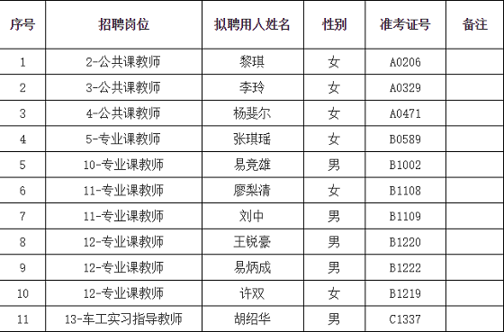 根據(jù)《湖南省工業(yè)技師學(xué)院2020年公開招聘公告》及有關(guān)規(guī)定,經(jīng)報名、資格審查、筆試、實操、試講、體檢、考察等程序,經(jīng)學(xué)校公開招聘工作領(lǐng)導(dǎo)小組研究,確定黎琪等11名同志為湖南省工業(yè)技師學(xué)院2020年公開招聘擬聘用人選,現(xiàn)予以公示。