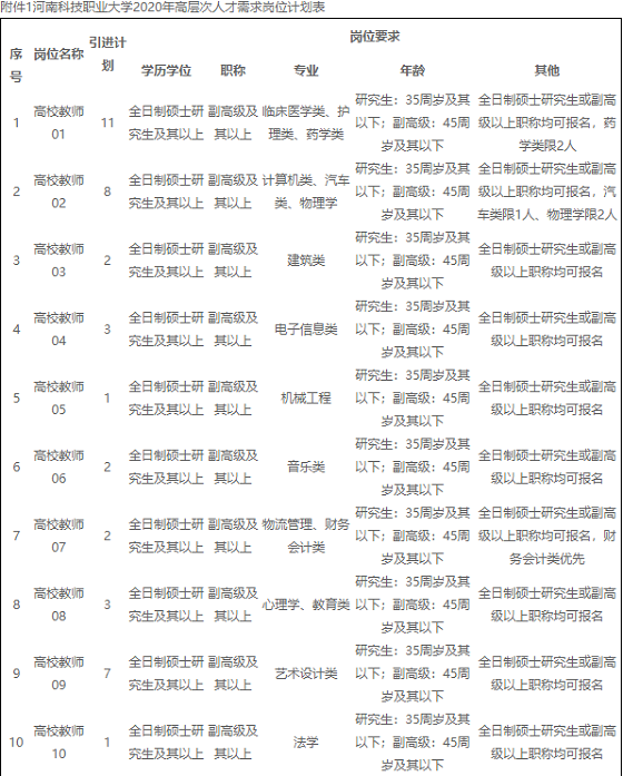 附件1河南科技職業(yè)大學(xué)2020年高層次人才需求崗位計(jì)劃表
