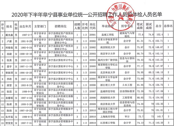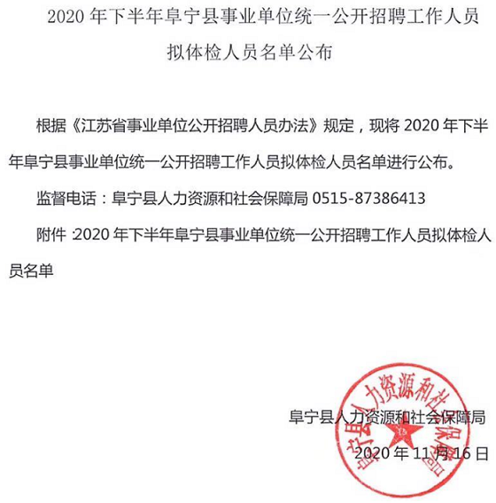 2020年下半年鹽城阜寧縣事業(yè)單位統(tǒng)一公開(kāi)招聘工作人員擬體檢人員名單公布