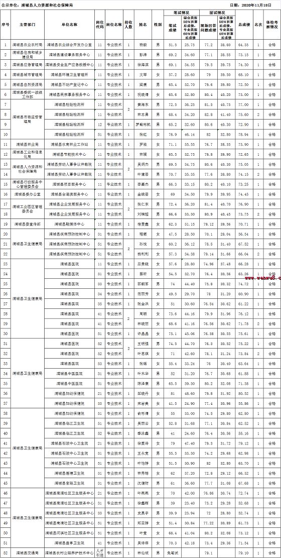 2020年福建省南平浦城縣事業(yè)單位公開招聘工作人員擬聘用名單公示