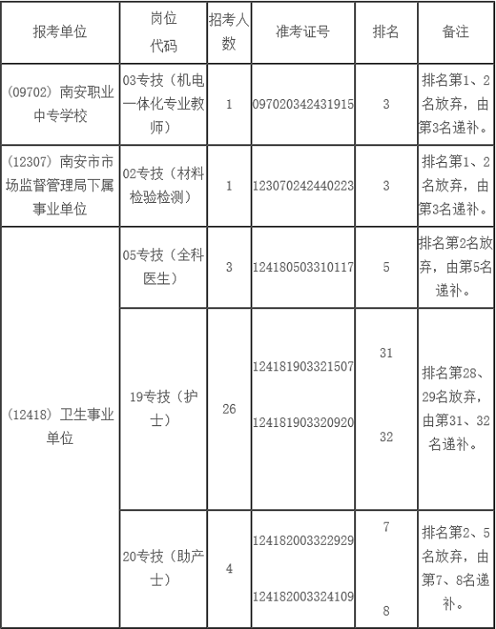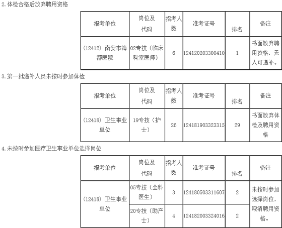 根據(jù)招考公告,考生在資格復(fù)審、體檢等環(huán)節(jié)因不合格或棄權(quán)等原因造成崗位空缺的,在該崗位符合條件的其他考生中按綜合成績從高到低的順序依次等額遞補,第二批遞補人員具體名單如下: