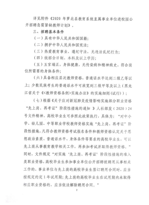 2020年黑龍江鶴崗蘿北縣教育系統(tǒng)進(jìn)校園公開招聘急需緊缺教師【40人】