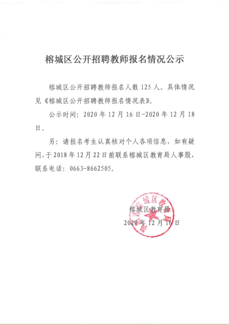2020年廣東揭陽榕城區(qū)公開招聘教師報(bào)名情況公示