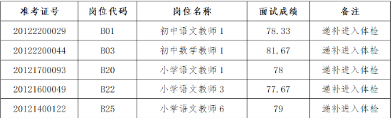 因部分考生放棄在我區(qū)的擇業(yè)資格,根據(jù)《無錫高新區(qū)(新吳區(qū))教育系統(tǒng)2021年校園招聘教師公告》規(guī)定,按照報(bào)考同一崗位的人員,面試成績從高到低依次遞補(bǔ)的原則,現(xiàn)有以下考生遞補(bǔ)進(jìn)入體檢環(huán)節(jié):