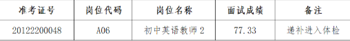 因部分考生放棄在我區(qū)的擇業(yè)資格,根據(jù)《無錫高新區(qū)(新吳區(qū))教育系統(tǒng)2021年校園招聘教師公告》規(guī)定,按照報(bào)考同一崗位的人員,面試成績從高到低依次遞補(bǔ)的原則,現(xiàn)有以下考生遞補(bǔ)進(jìn)入體檢環(huán)節(jié):