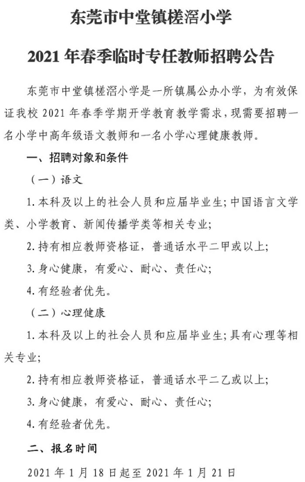 2021年廣東東莞市中堂鎮(zhèn)槎滘小學(xué)春季臨時(shí)專任教師招聘公告【2人】