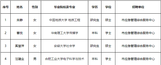 附件:2020年蕪湖市應(yīng)急管理局赴全國重點院校公開招聘緊缺專業(yè)應(yīng)屆畢業(yè)生擬聘用人員名單