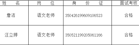 根據(jù)《思明區(qū)教育系統(tǒng)非在編聘用人員公開(kāi)招聘實(shí)施細(xì)則(廈思教〔2014〕95號(hào))》及《廈門外國(guó)語(yǔ)學(xué)校瑞景分校補(bǔ)充非在編人員招聘簡(jiǎn)章》要求,現(xiàn)將擬聘用人員的面試考核結(jié)果公示如下: