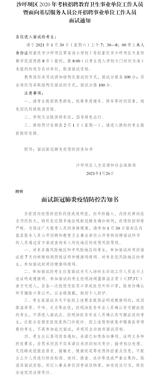 2020年重慶沙坪壩區(qū)考核招聘教育衛(wèi)生事業(yè)單位工作人員暨面向基層服務(wù)人員公開招聘事業(yè)單位工作人員面試通知