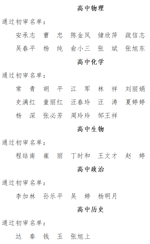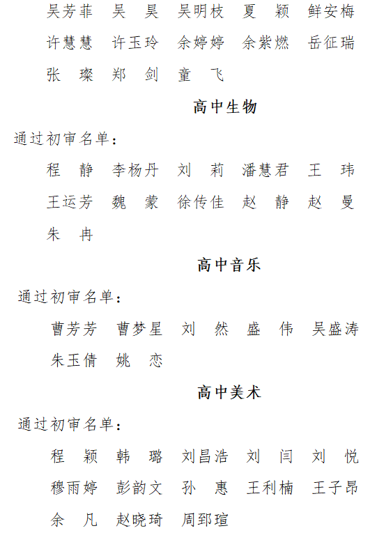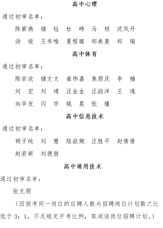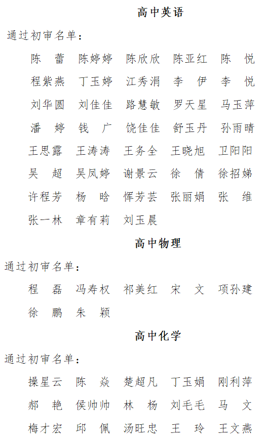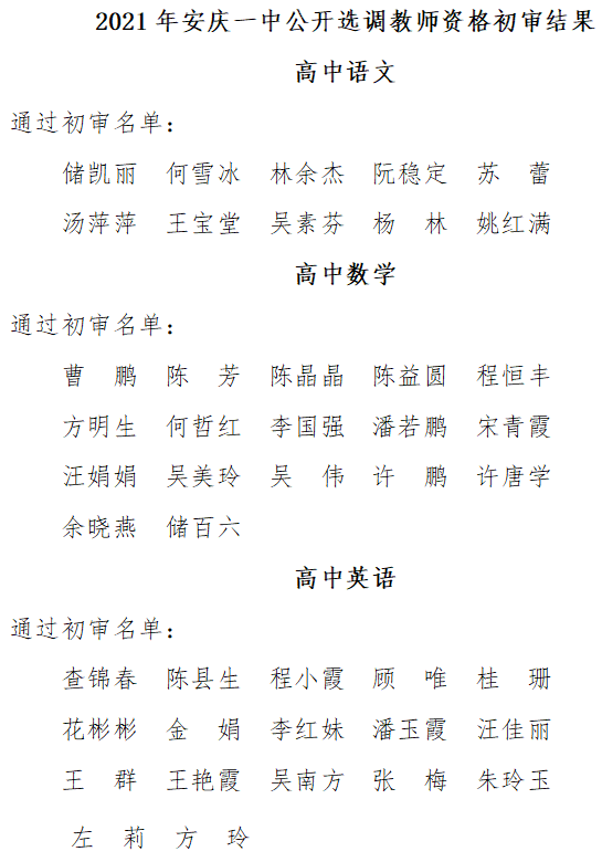 根據(jù)《安徽省安慶市第一中學(xué)面向高校公開(kāi)招聘2021屆優(yōu)秀畢業(yè)生公告》《安慶一中面向全國(guó)公開(kāi)選調(diào)優(yōu)秀高中教師公告》,市教體局、市委編辦、市人社局、市紀(jì)委監(jiān)委駐市教體局紀(jì)檢組、安慶一中聯(lián)合組成資格審查小組,對(duì)在規(guī)定時(shí)間內(nèi)提交報(bào)名材料人員進(jìn)行了資格初審。經(jīng)報(bào)安慶一中教師招聘、選調(diào)工作領(lǐng)導(dǎo)小組研究同意,現(xiàn)將資格初審?fù)ㄟ^(guò)名單予以公布: