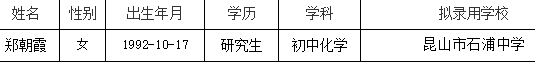 根據(jù)《2020年昆山市教育系統(tǒng)公開招聘中小學(xué)教師簡章》,鄭朝霞(人員信息附后)已通過昆山市教育局組織的筆試、面試、體檢(因懷孕緩檢)和考察,現(xiàn)進(jìn)行錄用公示,公示時間為2021年2月18日~2021年2月25日。如對公示對象有異議,可在公示期間向昆山市教育局反映,聯(lián)系電話:57553129。