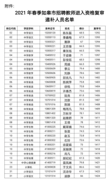 附件:2021年春季如皋市招聘教師進入資格復審遞補人員名單