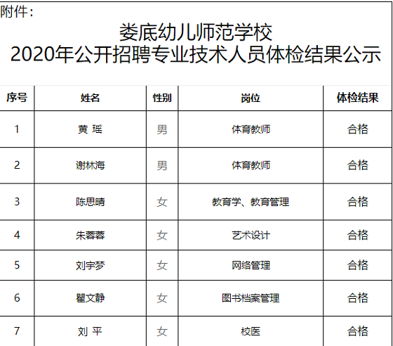 附件:婁底幼兒師范學(xué)校2020年公開招聘專業(yè)技術(shù)人員體檢結(jié)果公示