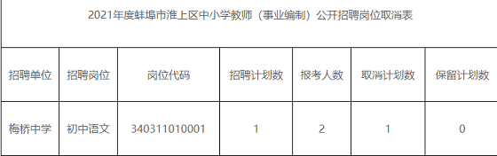 根據(jù)《2021年度蚌埠市淮上區(qū)中小學教師(事業(yè)編制)公開招聘公告》要求,經(jīng)前期網(wǎng)上報名、資格初審和繳費確認,有1個崗位達不到開考比例被取消,現(xiàn)予以公布(詳見附件)。