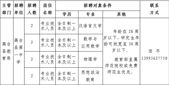 2.招聘對(duì)象不限生源和戶(hù)籍,同等條件下優(yōu)先招聘研究生學(xué)歷人員和高臺(tái)縣生源畢業(yè)生。