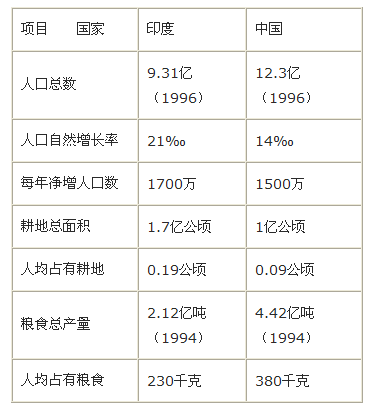 從以上對比可以看出印度雖然耕地面積比中國大,發(fā)展農(nóng)業(yè)的自然條件也比中國好,而且人口也比中國少,但是印度的糧食總產(chǎn)量比中國少得多,人均占有糧食的數(shù)量也比中國少許多。我們中國能夠用占世界7%的耕地養(yǎng)活了占世界22%的人口,這充分說明了解放后,特別在改革開放后的中國在社會主義建設(shè)方面取得了巨大的成就。(這部分內(nèi)容課本是沒有的,但可以利用這個素材對學(xué)生進行愛國主義教育)