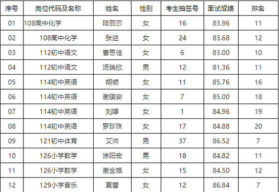 根據(jù)《2021年桂陽縣城區(qū)學校公開招聘普通高校師范類專業(yè)應(yīng)屆畢業(yè)生公告》精神,因報考人員放棄復(fù)審資格或資格復(fù)審不合格的,在報考該崗位人員中按面試成績從高分到低分依次遞補,但不實行跨崗位調(diào)劑。因高中化學等崗位報考人員放棄復(fù)審資格,現(xiàn)遞補以下崗位考生為現(xiàn)場資格復(fù)審對象。具體崗位及名單如下: