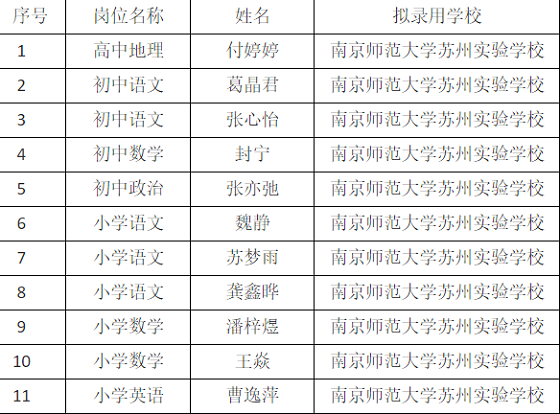 根據(jù)《2021年蘇州大學(xué)實(shí)驗(yàn)學(xué)校管理辦公室招聘中小學(xué)教師簡(jiǎn)章》之規(guī)定,經(jīng)筆試、面試、考察(政審)、體檢等程序,現(xiàn)對(duì)擬錄用人員進(jìn)行公示,公示時(shí)間為五個(gè)工作日(4月23日—4月28日)。