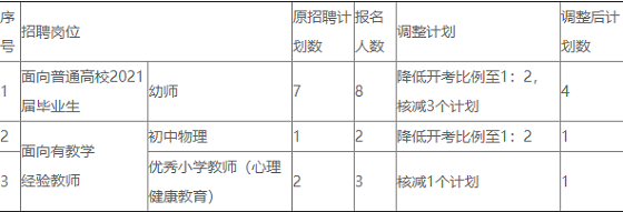根據(jù)《2021年株洲市蘆淞區(qū)公開招聘中小學(xué)和幼兒園教師公告》,招聘單位于2021年4月27日至4月29日進(jìn)行了現(xiàn)場報(bào)名,現(xiàn)報(bào)名工作已結(jié)束。部分崗位報(bào)名人數(shù)未達(dá)到公告中要求的最低開考比例,經(jīng)研究決定,調(diào)整部分崗位招聘計(jì)劃。具體如下: