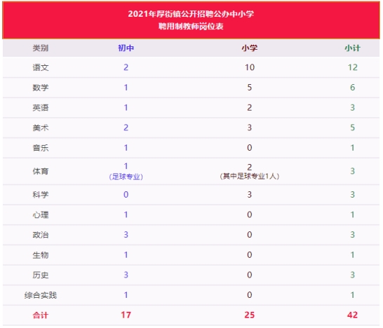 為促進(jìn)厚街鎮(zhèn)教育優(yōu)質(zhì)發(fā)展,保證我鎮(zhèn)公辦中小學(xué)校2021年秋季開(kāi)學(xué)教師需求,現(xiàn)計(jì)劃面向社會(huì)公開(kāi)招聘聘用制教師42名。具體內(nèi)容如下: