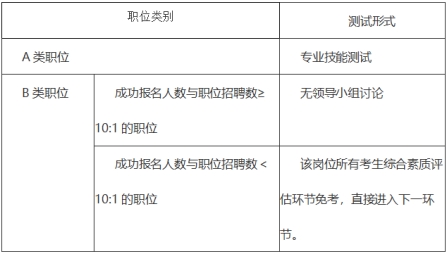 3.綜合素質(zhì)評估主要采取專業(yè)技能測試、無領(lǐng)導(dǎo)小組討論等形式,對考生進(jìn)行考察。各職位具體考核形式見下表。