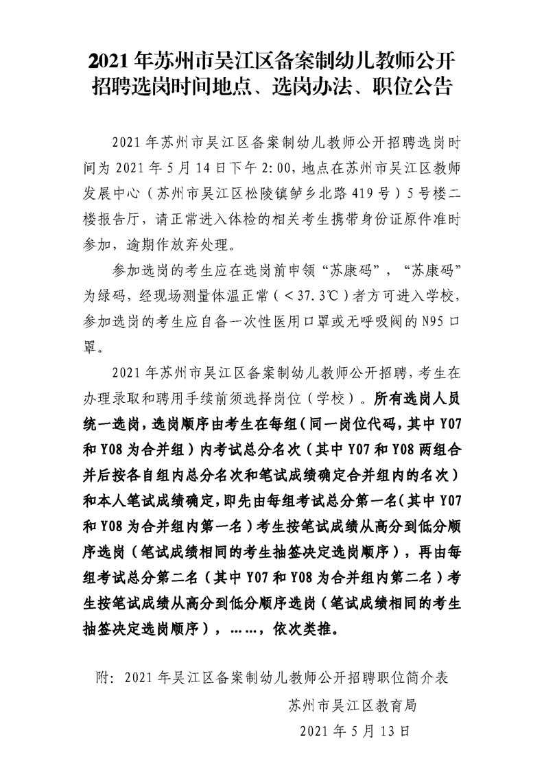 2021年蘇州市吳江區(qū)備案制幼兒教師公開(kāi)招聘選崗時(shí)間地點(diǎn)、選崗辦法、職位公告