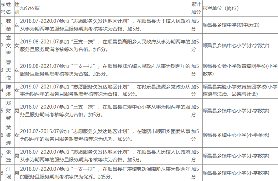 根據(jù)《2021年順昌縣中小學(xué)幼兒園教師招聘方案》(順政教〔2021〕21號)要求,對筆試成績加分人員名單進行公示(公示時間2021年5月17日--5月21日),在此期間歡迎廣大群眾以來信來電來訪的形式實事求是反映情況,接待(來信投遞)股室:順昌縣教育局人事股,聯(lián)系電話:0599-7830715。