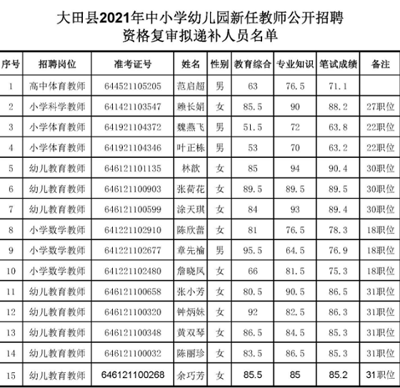 附件:大田縣2021年中小學(xué)幼兒園新任教師公開招聘資格復(fù)審擬遞補人員名單