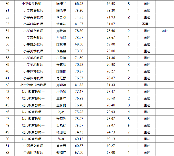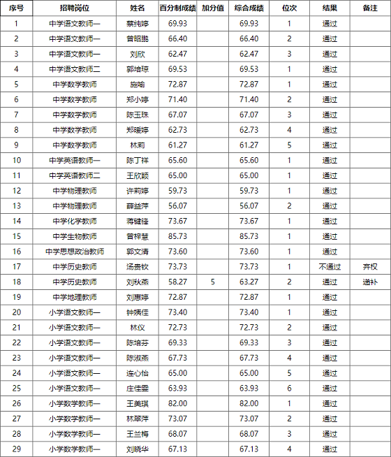 根據(jù)《2021年泉州市泉港區(qū)公辦學校公開招聘新任教師公告》和《關于組織2021年泉州市泉港區(qū)公辦學校公開招聘新任教師筆試入圍人員資格復審的通告》精神,泉港區(qū)教育局組織對入圍人員進行資格復審,現(xiàn)將資格復審結果公布如下: