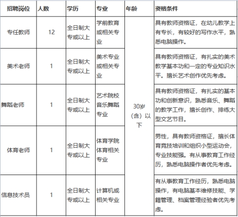 本次招聘幼兒園教師共16人,具體崗位及招聘條件如下表: