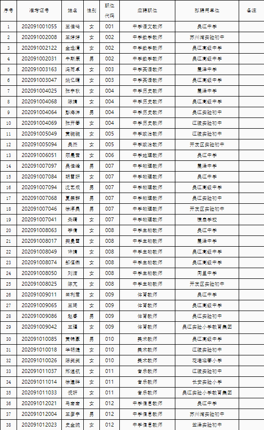 根據(jù)《蘇州市吳江區(qū)教育系統(tǒng)2021年選聘優(yōu)秀畢業(yè)生簡章》,經(jīng)過綜合能力素質(zhì)評價、面試、體檢、考察(政審)等程序,以下擬聘用人員予以公示。