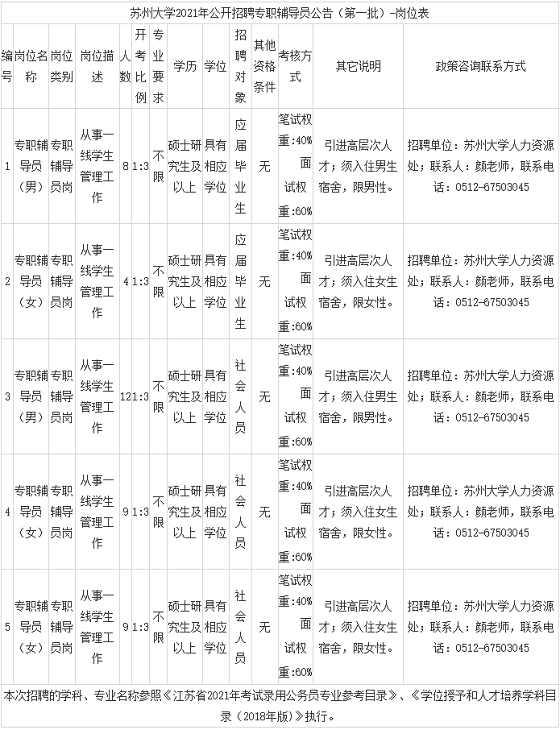 附件:蘇州大學(xué)2021年公開招聘專職輔導(dǎo)員公告(第一批)崗位表(附后)