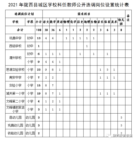 根據(jù)2021年部分城區(qū)學(xué)校教師需求,擬公開選調(diào)科任教師108名,其中初中教師20名、小學(xué)教師80名、幼兒園教師8名。選調(diào)范圍為除鞏昌鎮(zhèn)、文峰鎮(zhèn)所在地的縣直學(xué)校和鞏昌學(xué)區(qū)所屬學(xué)校、文峰學(xué)區(qū)所屬學(xué)校以外的農(nóng)村學(xué)校在職公辦教師。具體崗位設(shè)置見下表。