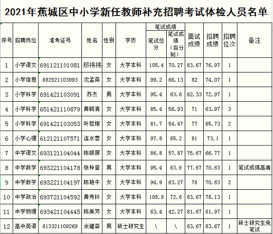 附:2021年蕉城區(qū)中小學(xué)新任教師補(bǔ)充招聘考試體檢人員名單