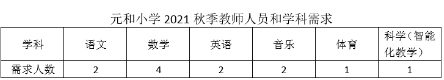 根據(jù)新學(xué)期學(xué)校實(shí)際情況,元和小學(xué)面向社會(huì)招聘合同制非編人員,各學(xué)科需求如下: