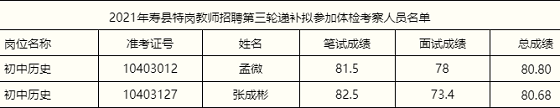 根據(jù)《安徽省2021年農(nóng)村義務(wù)教育階段學(xué)校教師特設(shè)崗位計劃招聘公告》精神,現(xiàn)將我縣2021年特崗教師招聘第三輪遞補擬參加體檢考察人員名單公告如下,請按要求及時完成體檢、考察、調(diào)檔等工作。