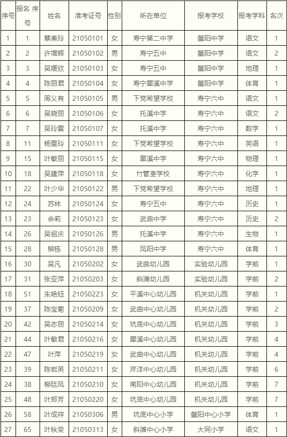 備注:因實驗幼兒園學前教育崗位選調3人中出現(xiàn)第三名并列、鰲陽中心小學語文崗位選調1人中出現(xiàn)第一名并列、大同小學語文崗位選調3人中出現(xiàn)第三名并列,經壽寧縣教師招聘和進城選調工作領導小組研究,決定對以上崗位并列的6名人員重新安排考試,每個崗位擇優(yōu)選調1人,考試等具體事項另行通知。