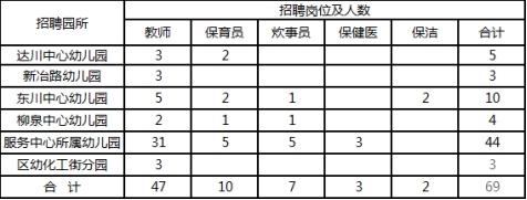 為確保西固區(qū)學(xué)前教育服務(wù)中心所屬各幼兒園保教及日常工作的順利開展,按照“兩教一!睒(biāo)準,現(xiàn)需招聘以下崗位及人數(shù),具體見下表: