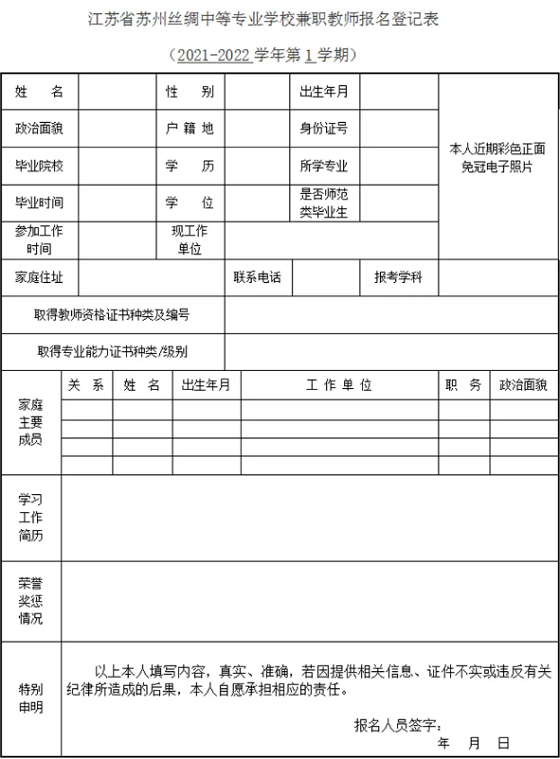 有意應(yīng)聘者請(qǐng)?zhí)顚憽督K省蘇州絲綢中等專業(yè)學(xué)校兼職教師報(bào)名登記表》(請(qǐng)使用微信電腦客戶端點(diǎn)擊本文左下角閱讀原文下載,也可訪問(wèn)學(xué)校官網(wǎng)招聘新聞中下載),并將身份證、教師資格證、最高學(xué)位證、最后學(xué)歷證、專業(yè)技術(shù)職務(wù)證等證書(件)掃描件、其他能證明教學(xué)能力的材料發(fā)到指定郵箱: