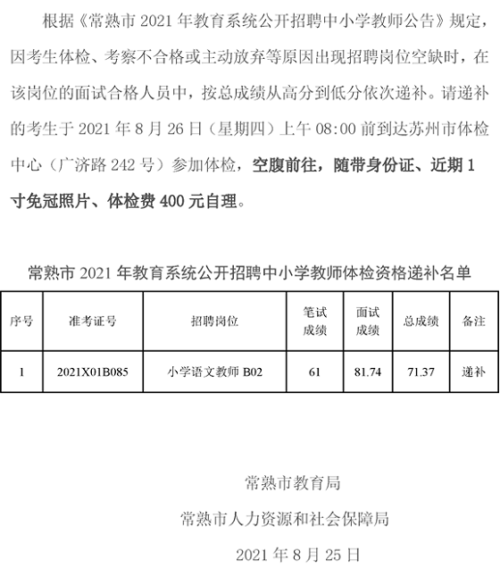 2021年江蘇蘇州常熟市教育系統(tǒng)公開(kāi)招聘中小學(xué)教師體檢資格遞補(bǔ)公告(七)