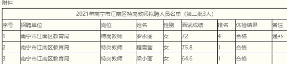 附件:2021年南寧市江南區(qū)特崗教師擬聘人員名單(第二批3人)