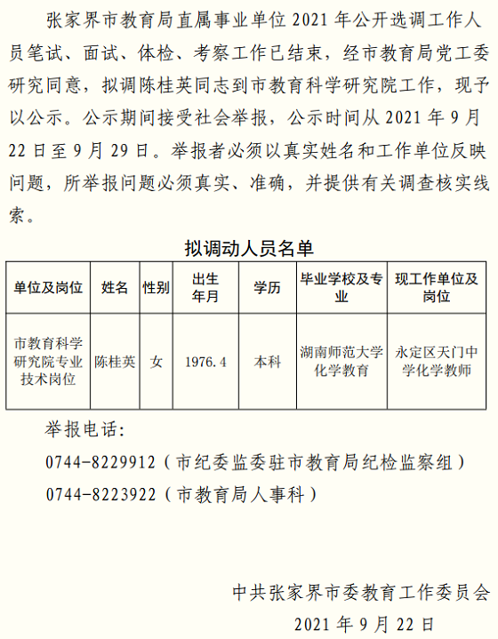 2021年湖南張家界市教育局直屬事業(yè)單位公開選調(diào)工作人員擬調(diào)動(dòng)人員公示